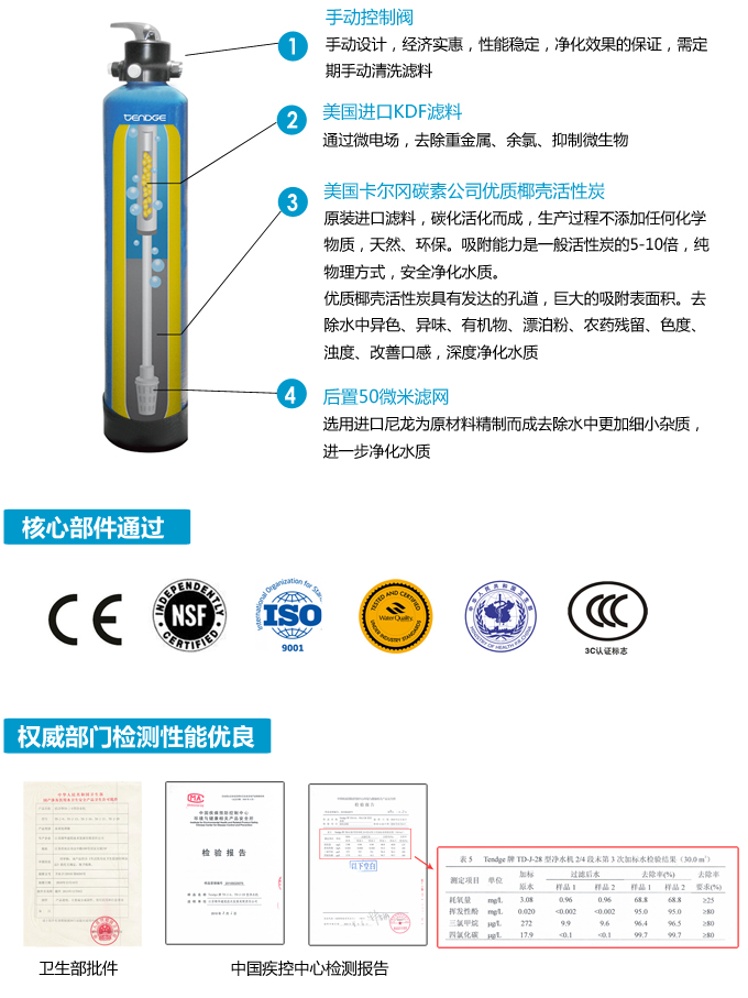 手動中央凈水機有效去除水中的異色、異味;進一步濾除水中微小雜質、膠狀體;去除水中的漂白粉余氯、農藥、重金屬;保留對人體有益的礦物質。使水變得碧清、碧藍,去除對人體有害的物質。