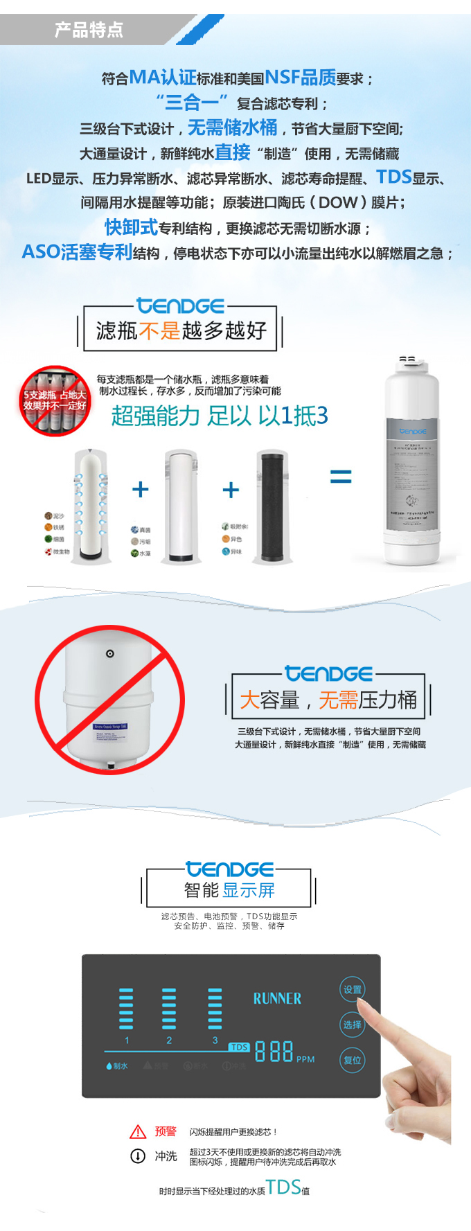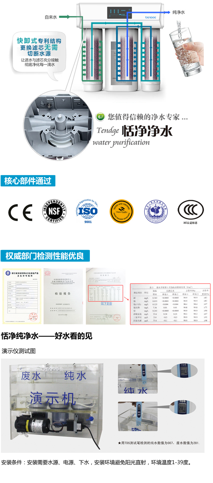 恬凈家用純水機讓家中的飲用水更健康、更安全、更衛生。水燒開再也不會結垢,口感甘甜,綿柔。能夠去除水中所有有毒氣體及重金屬全部去除,使用范圍更廣泛。飲用、淘米、洗菜、煲湯、煮飯均可用高品質的直飲水。